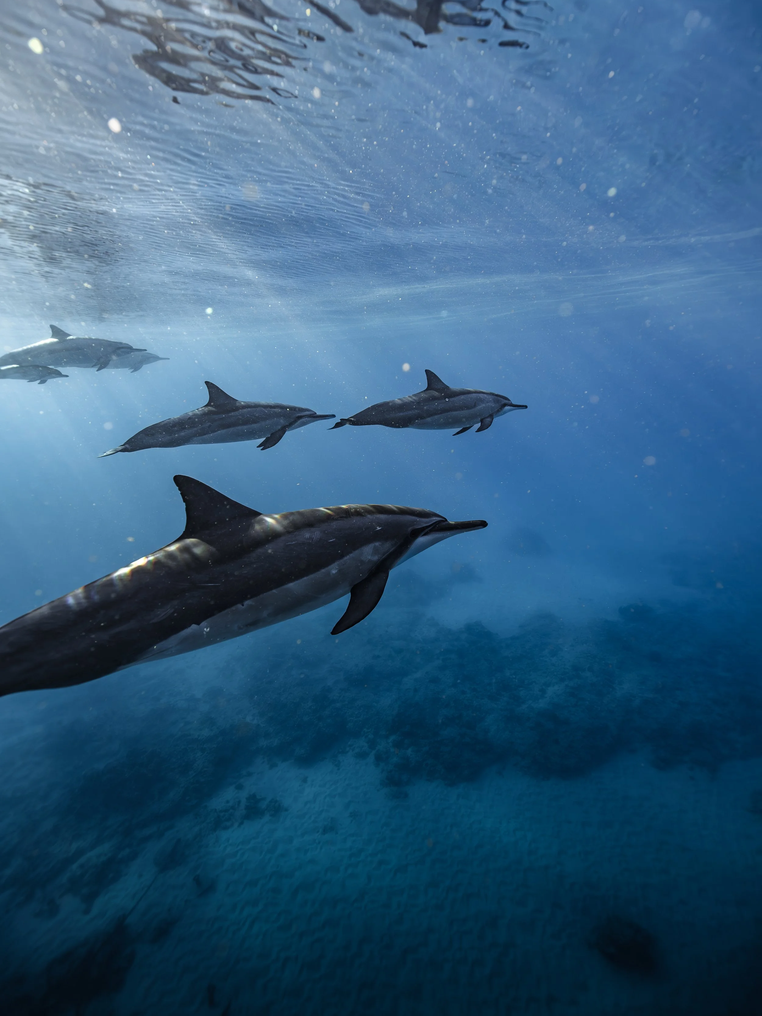 Spinner dolphins typically spend their nights hunting offshore in deeper water, feeding on small fish and squid that migrate toward the surface after dark. During the day, they often move into sheltered coastal bays around Oahu to rest and socialize.