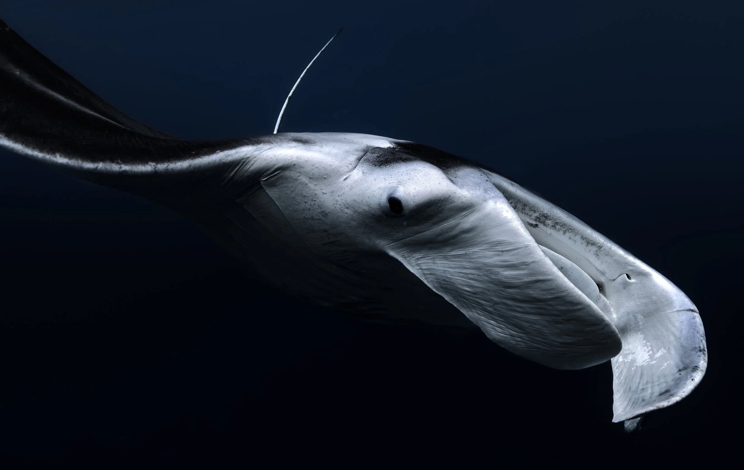 Manta rays feed primarily on tiny plankton and small organisms that drift in ocean currents. Unlike stingrays, they do not have a stinger and are completely harmless to humans. When feeding, mantas often perform slow looping movements through the water to filter plankton into their mouths.